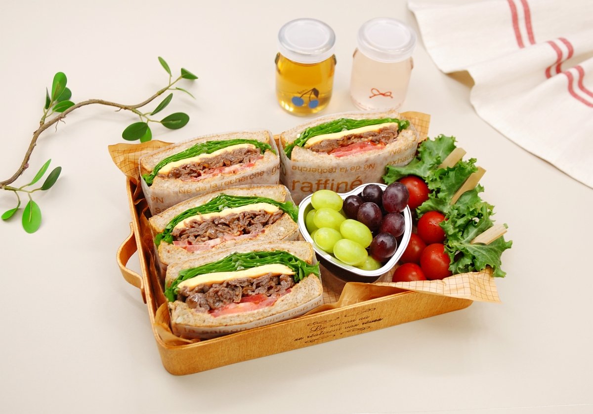 조리법도 어렵지 않다. 먼저 샤브샤브용 호주청정우 앞다리살의 핏기를 제거한 뒤 불고기 양념을 버무려 밑간을 한다. 토마토는 적당한 두께로 썰어 키친타월로 수분을 제거하고, 로메인은 깨끗이 씻어 먹기 좋게 손질한다. 식빵은 마른 팬에 노릇하게 구워 바삭한 식감을 살린다. 이후 예열된 팬에 기름을 살짝 두르고 양념한 불고기를 볶아낸 뒤 한 김 식혀 준비한다. 구운 식빵 한쪽 면에는 마요네즈와 고추냉이를 섞은 소스를 고르게 펴 바르고 로메인, 치즈, 불고기, 토마토를 차례로 올린 뒤 소스를 바른 식빵으로 덮어주면 완성된다. 달콤하면서도 알싸한 풍미가 어우러져 입맛을 돋우는 벚꽃 나들이 도시락 메뉴로 손색없다.